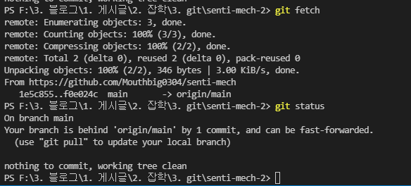 두번째 폴더에 들어가서 fetch 후 상태를 확인하니 하나 뒤쳐져있다 나오네요.